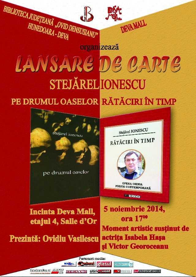 Miercuri, 5 noiembrie 2014, ora 17.00, în incinta Deva Mall, etajul patru, Salle d’Or, Biblioteca Judeţeană „Ovid Densuşianu” Hunedoara-Deva organizează lansarea volumelor de versuri intitulate “Rătăciri în timp” şi „Pe drumul oaselor” al căror autor este poetul Stejărel Ionescu, apărute la Editura Tipo Moldova din Iaşi şi, respectiv, Editura Măiastra din Tg. Jiu, în ţinute grafice deosebite. În cadrul lansării va avea loc un moment artistic susținut de actrița Isabela Hașa și Victor Georoceanu. Prezintă: Ovidiu Vasilescu.