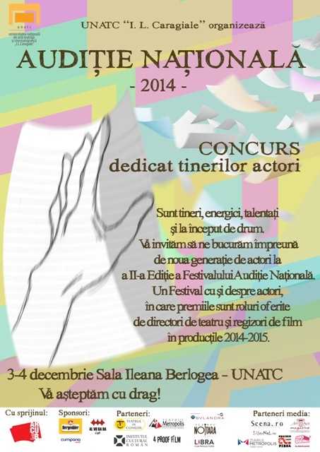 După jurizarea celor 68 de înscrieri primite, concursul pentru tineri actori Audiție Națională 2014, organizat de Universitatea Națională de Artă Teatrală și Cinematogarfică I.L.Caragiale, cu sprijinul ARCUB, a ajuns la etapa finală. Aceasta se va desfășura în perioada 3-4 decembrie 2014, la sala Ileana Berlogea. Cei 33 de finaliști din toată țara, vor prezenta, în fața publicului și a juriului, one man/one woman show-ul de 7-10 minute trimis pe suport video la înscriere. Din comisia finală de selecție fac parte: regizorul Alexandru Darie – Director al Teatrului Bulandra, actorul George Ivaşcu – Director al Teatrului Metropolis, actorul George Mihăiţă – Director al Teatrului de Comedie, actrița Diana Lupescu – reprezentant al Teatrului Nottara, actrița Mihaela Păun – Director ARCUB, regizorul Adrian Sîrbu, regizorul Cătălin Peter Netzer, regizorul Radu Jude, regizorul Alexandru Mavrodineanu, actorul Paul Chiribuță – Decan al Facultății de Teatru.