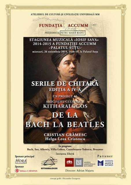 Chitaristul Cristian Grămesc, absolvent al cursurilor de master ale prestigioasei Academii „Mozarteum” din Salzburg, propune un periplu muzical „de la Bach la Beatles”, fiecare piesă din recital fiind o bornă a unei epoci muzicale. Publicul va putea audia lucrări din Barocul muzical (Bach), trecând prin epoca clasică (Sor) şi cea romantică (Albeniz), intrând apoi în secolul XX cu doi reprezentanţi ai neoromantismului (Asencio şi Castelnuovo-Tedesco) şi o incursiune în muzica folk şi pop-rock, cu două aranjamente după un cântec irlandez şi după celebra „Yesterday” a trupei Beatles. În deschiderea concertului, eleva Helga-Leea Cristescu va susţine un microrecital cu lucrări scrise de Baden Powell, Leo Brouwer şi Heitor Villa-Lobos.
