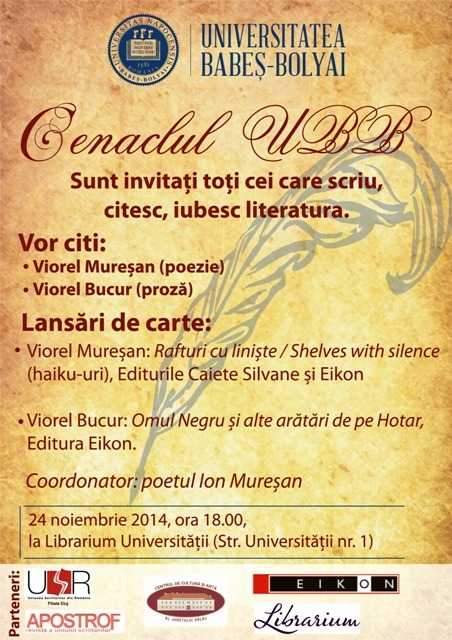 Luni, 24 noiembrie 2014, de la ora 18, la Librarium Universității (Cluj-Napoca, str. Universității nr. 1) va avea loc o nouă întâlnire a Cenaclului UBB condus de poetul Ion Mureșan. Vor citi Viorel Mureșan (poezie) și Viorel Bucur (proză). Cu acest prilej vor fi lansate și cărțile semnate de Viorel Mureșan, ”Rafturi cu liniște/Shelves with silence”, haiku-uri, versiune în limba engleză de Teodor Mateoc; prezentare grafică de Emil Chendea (Editurile Caiete Silvane și Eikon) și Viorel Bucur, ”Omul negru și alte arătări de pe Hotar” (Editura Eikon). Parteneri: USR filiala Cluj, Apostrof, Centrul de Cultură și Artă al Județului Sălaj, Editura Eikon, Librarium.