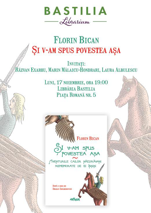Luni, 17 noiembrie 2014, ora 19:00, în mansarda Al 9-lea cer din incinta librăriei Bastilia, Piața Romană nr. 5, Libraria Bastilia și Editura Arthur au plăcerea de a vă invita la lansarea cărții ”Și v-am spus povestea așa. Aventurile cailor năzdrăvani rememorate de ei înșiși ”de Florin Bican, cu ilustrații de Mircea Pop. Invitați: Răzvan Exarhu, Marin Mălaicu-Hondrari, Laura Albulescu.