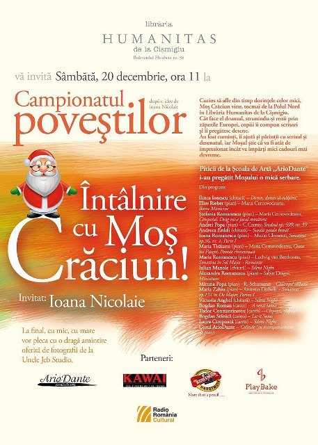 Sâmbătă, 20 decembrie 2014, de la ora 11.00, copii, părinţi şi bunici sunt aşteptaţi la întâlnirea cu Moş Crăciun, la Librăria Humanitas de la Cişmigiu, la ultima ediţie din acest an a Campionatului Poveştilor.