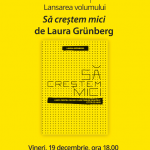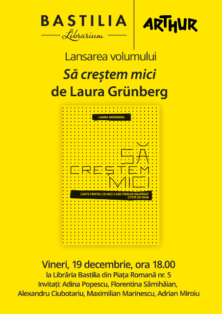 Vineri, 19 decembrie 2014, de la ora 18.00, Editura Arthur vă invită la Libraria Bastilia (Piața Romană nr. 5, București), la evenimentul de lansare a cărții „Să creștem mici” de Laura Grünberg. Participă: oameni mari, plutitori sau pufoşi: Adina Popescu, Florentina Sâmihăian, Alexandru Ciubotariu, Adrian Miroiu şi Maximilian Marinescu.