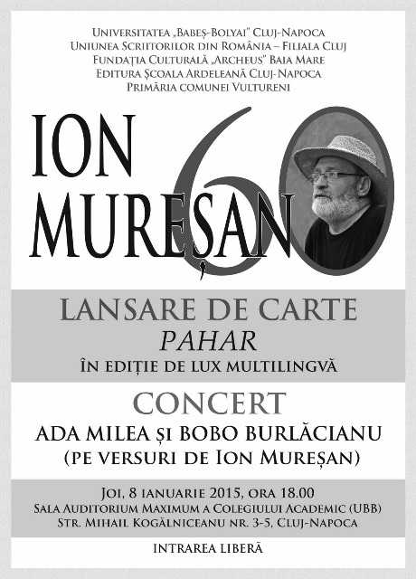Joi, 8 ianuarie 2015, ora 18, în Sala Auditorium Maximum a Colegiului Academic (UBB), Str. Mihail Kogălniceanu nr. 3-5, Cluj-Napoca, Universitatea „Babeş-Bolyai” Cluj-Napoca, Uniunea Scriitorilor din România – Filiala Cluj , Fundaţia Culturală „Archeus” Baia Mare, Editura Şcoala Ardeleană Cluj-Napoca şi Primăria Comunei Vultureni vă invită la o seară specială de poezie şi muzică ”Ion MUREŞAN – 60”.