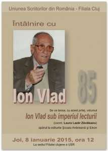 Agențiadecarte.ro vă prezintă evenimentele lunii ianuarie 2015 organizate de Uniunea Scriitorilor din România- Filiala Cluj. Joi, 8 ianuarie 2015, ora 12.oo, la sediul Filialei clujene a USR (str. Universităţii nr. 1), va avea loc o întâlnire cu Ion VLAD. Cu acest prilej, va fi lansat volumul Ion Vlad sub imperiul lecturii (coord. Laura Lazăr Zăvăleanu), apărut la editurile Şcoala Ardeleană şi Eikon.