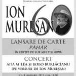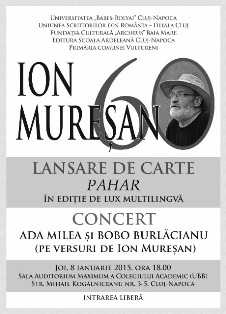 Joi, 8 ianuarie 2015, ora 18.00, în Sala Auditorium Maximum a Colegiului Academic (UBB), Str. Mihail Kogălniceanu nr. 3-5, Cluj-Napoca, va avea loc o seară specială de poezie şi muzică, dedicată poetului Ion Mureșan, cu ocazia împlinirii a 60 de ani. În cadrul evenimentului, ”Ion MUREŞAN – 60”, va fi lansat volumul “Pahar”, într-o ediţie de lux multilingvă realizată de Editura Şcoala Ardeleană din Cluj-Napoca. Poemul este ilustrat cu 10 desene de Ioan Marchiș şi secondat de versiuni în engleză (traducere de Virgil Stanciu), franceză (traducere de Dumitru Ţepeneag), germană (traducere de Ernest Wichner), italiană (traducere de Danilo De Salazar) şi maghiară (traducere de Szántaiv János). Lansarea va fi urmată de un concert susținut de Ada Milea şi Bobo Burlăcianu pe versuri de Ion Mureşan.
