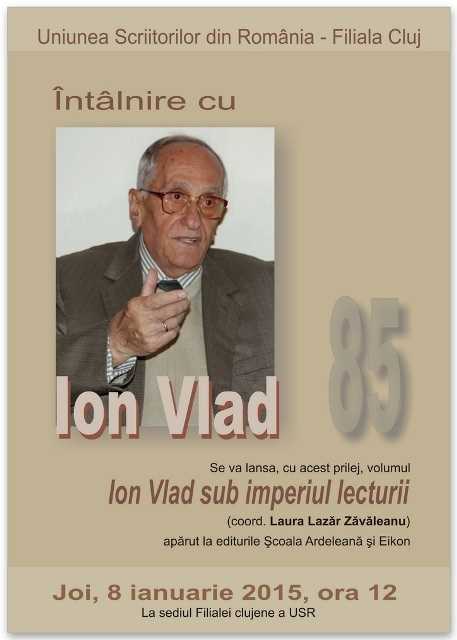 Joi, 8 ianuarie 2015, ora 12, la sediul Filialei clujene a USR (str. Universităţii nr. 1), Uniunea Scriitorilor din România – Filiala Cluj vă invită la o Întâlnire cu Ion VLAD. Cu acest prilej, va fi lansat volumul ”Ion Vlad sub imperiul lecturii” (coord. Laura Lazăr Zăvăleanu), apărut la editurile Şcoala Ardeleană şi Eikon. Dedicat celor 85 de ani ai Profesorului Ion VLAD, volumul reuneşte următoarele semnături: Diana ADAMEK, Nicolae BĂCIUŢ, Horia BĂDESCU, Iulian BOLDEA, Ştefan BORBÉLY, Ion BRAD, Ion BUZAŞI, Ion COCORA, Ion CREŢU, Constantin CUBLEŞAN, Niculae GHERAN, Gheorghe GLODEANU, Rodica GRIGORE, Ion ISTRATE, Ştefan MANASIA, Ileana MĂLĂNCIOIU, Andrei MOLDOVAN, Mircea MUTHU, Olimpiu NUŞFELEAN, Dora PAVEL, Laura PAVEL, Irina PETRAŞ, Petru POANTĂ, Horea POENAR, Ioan-Aurel POP, Ion POP, Mircea POPA, D.R. POPESCU, Titu POPESCU, Nicolae PRELIPCEANU, Ilie RAD, Aurel SASU, Ion TALOŞ, Cornel UNGUREANU, Eugen URICARU, Traian VEDINAŞ.