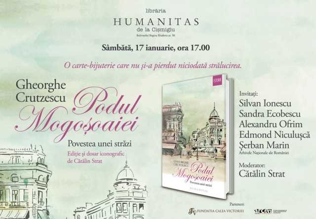 Sâmbătă, 17 ianuarie 2015, de la ora 17.00, la Librăria Humanitas de la Cişmigiu, va avea loc o întâlnire cu Silvan Ionescu, Sandra Ecobescu, Alexandru Ofrim, Edmond Niculuşcă şi Şerban Marin prilejuită de apariţia ediţiei Humanitas a celebrei cărţi-document “Podul Mogoşoaiei. Povestea unei străzi”, de Gheorghe Crutzescu. Seară dedicată „străzii care a întrupat însăşi viaţă acestui oraş“, a Bucureştiului, va fi moderată de editorul Cătălin Strat.
