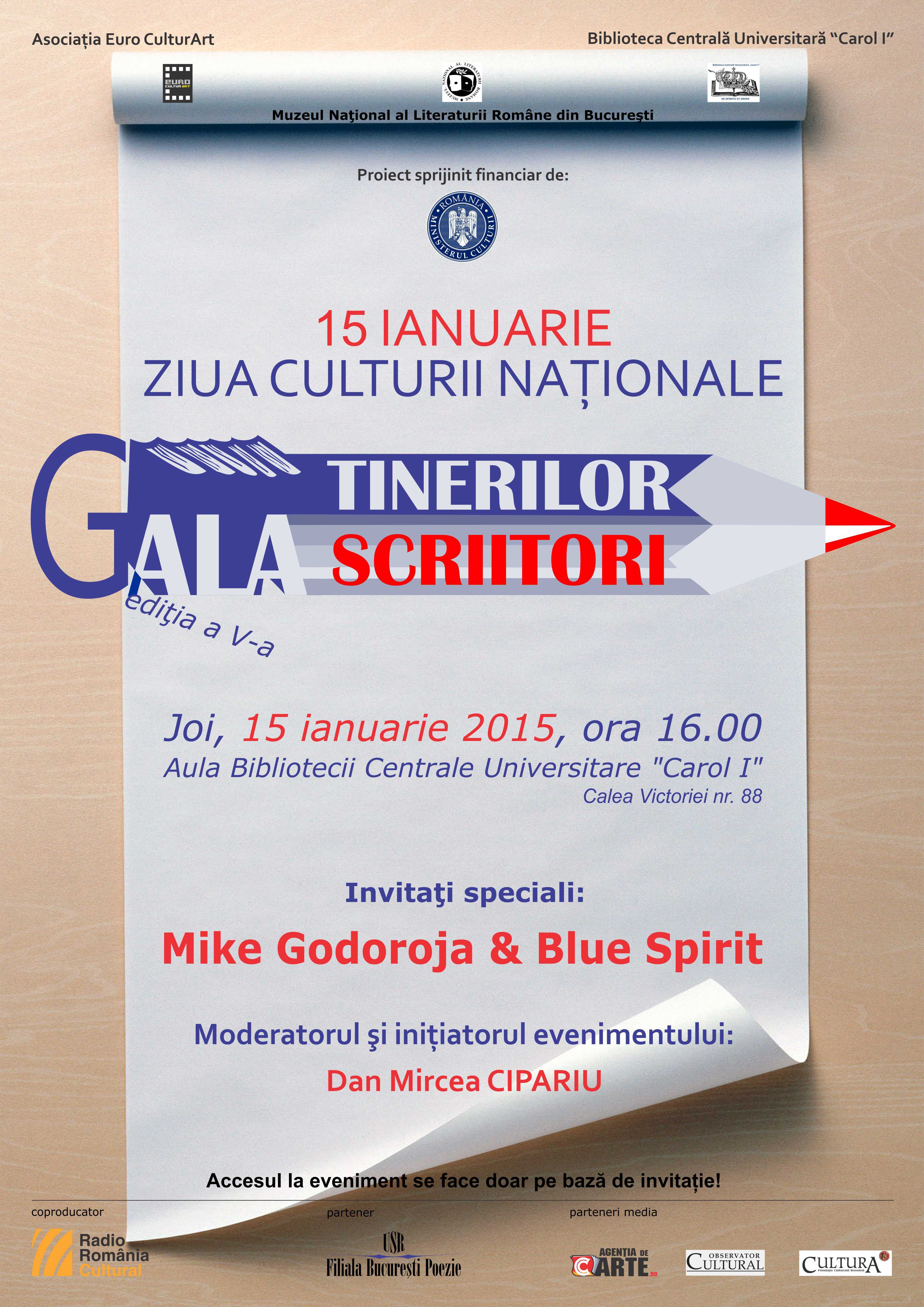 Joi, 15 ianuarie 2015, ora 16:00, în Aula Bibliotecii Centrale Universitare “Carol I” din Bucureşti (Calea Victoriei, nr.88), va avea loc ediţia a V-a a Galei Tinerilor Scriitori / CARTEA DE POEZIE A ANULUI 2014. Radio România Cultural va transmite în direct evenimentul (producător: Anamaria Spătaru). Juriul a fost format din critici literari care au câştigat Premii în cadrul Galei la ediţiile din 2012, 2013 şi 2014: Bianca Burţa-Cernat, Mihai Iovănel şi Andrei Terian. Câştigătorul Premiului “Cartea de Poezie a anului 2014” a fost desemnat scriitorul Octavian Soviany, pentru volumul „Călcâiul lui Magellan”, Editura Cartea Românească. Gala Tinerilor Scriitori se va desfăşura în cadrul unui eveniment multiart, avându-i invitaţi pe Mike Godoroja & Blue Spirit. Juriul a dat publicităţii cele 11 nominalizări pentru premiile “Tânărul poet al anului 2014″ (Sabina Comşa, Gabi Eftimie, Bogdan-Alexandru Stănescu, Ioan Şerbu şi Miruna Vlada), “Tânărul prozator al anului 2014″ (Lavinia Branişte, M.Duţescu şi Cristina Nemerovschi) şi “Tânărul critic literar al anului 2014” (Cosmin Borza, Andreea Mironescu şi Florina Pîrjol). Premiul “Tânărul Scriitor al anului 2014″ va fi anunţat în cadrul Galei şi îi va fi oferit unui scriitor dintre cei nominalizaţi de Juriul Galei Tinerilor Scriitori.