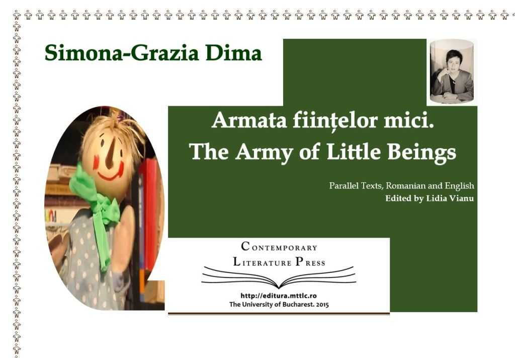 Contemporary Literature Press, sub auspiciile următoarelor foruri: Universitatea din  București, The British Council, Institutul Cultural Român  și Ambasada Irlandei, anunță publicarea volumului ”Armata ființelor mici. The Army of Little Beings. Texte paralele”, de Simona–Grazia Dima. Editat de Lidia Vianu. ISBN 978-606-8592-99-2