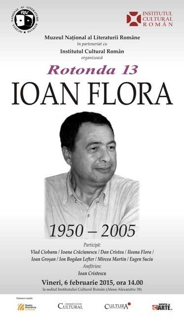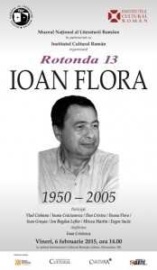 Vineri,  6 februarie 2015, ora 14.00, la sediul ICR Bucureşti (Aleea Alexandru, nr. 38, sector 1), Muzeul Naţional al Literaturii Române, în parteneriat cu Institutul Cultural Român, vă invită la „Rotonda 13” – Ioan Flora (1950 – 2005). Invitați: Vlad Ciobanu, Ioana Crăciunescu, Dan Cristea, Ileana Flora, Ioan Groșan, Ion Bogdan Lefter, Mircea Martin, Eugen Suciu, Paul Vinicius. Amfitrion: Ioan Cristescu. AgenţiadeCarte.ro este partener media al evenimentului.