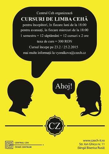 Centrul Ceh reia cursurile de limba cehă. Acestea încep luni, 23 februarie 2015, ora 18.00, pentru începători și miercuri, 25 februarie 2015, ora 18.00, pentru cei puțin avansați. Cursurile sunt ținute de Petra Adamkova, în limba engleză.