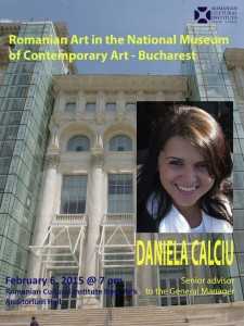 Daniela Calciu va susține în 6 februarie 2015, ora 19.00, la sala Auditorium a ICRNY, conferința ”National Museum of Contemporary Art from Romania – Priorities for 2015-2017 reflecting the visual culture of Romania in the local, regional, and international context”, care va sintetiza direcțiile strategice ale noului manager al MNAC, Călin Dan, care vor fi prezentate și în ciclul de evenimente dedicate împlinirii a 13 ani de la înființarea muzeului, din care, ultimii 10 ani în locația de la Palatul Parlamentului din București.