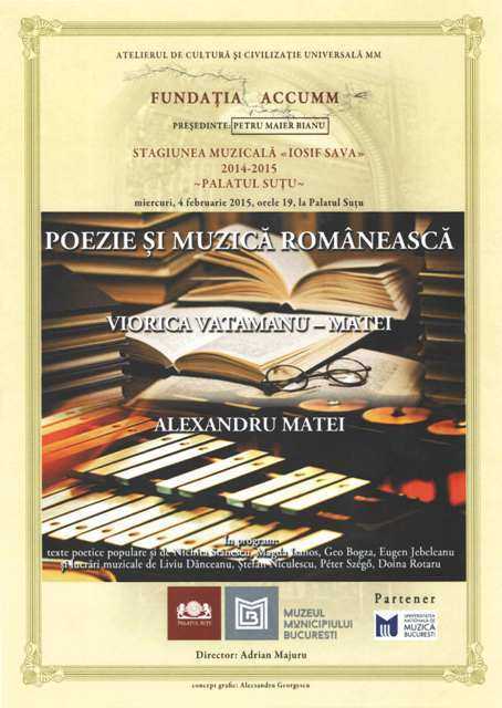 Miercuri, 4 februarie 2015 Muzică și poezie românească – Actrița Viorica Vatemanu-Matei și percuționistul Alexandru Matei, eveniment al fundaţiei ACCUM, parte din stagiunea “Iosif Sava” 2015, ora 19:00.