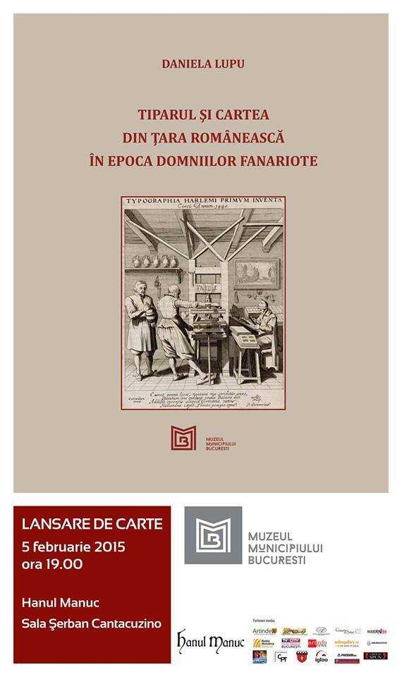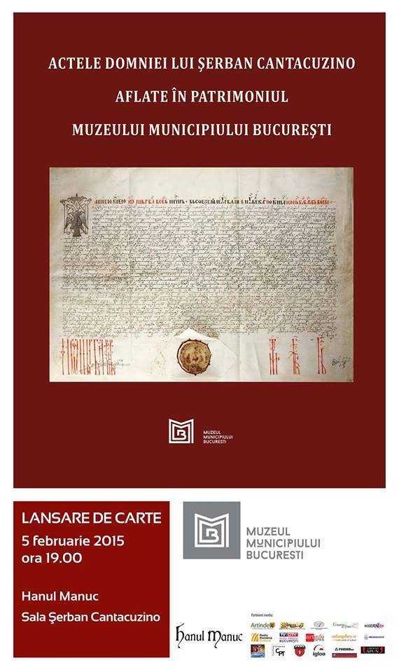 Joi 5 februarie 2015, dublă lansare de lansare de carte la Hanul lui Manuc, în sala Şerban Cantacuzino., ora 19:00: “Actele domniei lui Şerban Cantacuzino aflate în patrimoniul Muzeului Municipiului Bucureşti”, autor dr. Grina Mihaela Rafailă şi “Tiparul şi cartea din Ţară Românească în epoca domniilor fanariote (1716-1821)” autor dr. Daniela Lupu. Prezintă prof. univ. dr. Panait I Panait si dr. Constantin Rezachievici