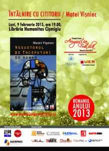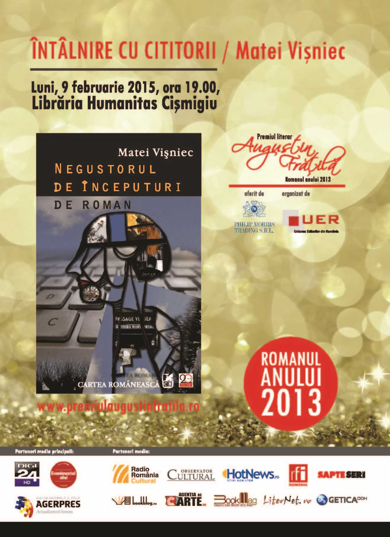 Luni, 9 februarie 2015, ora 19.00, la Librăria Humanitas Cişmigiu, Matei Vişniec  va răspunde întrebărilor cititorilor, bloggerilor si presei pornind de la volumul „Negustorul de începuturi de roman”, apărut la editura Cartea Românească şi  câştigător al Premiului literar „Augustin Frăţilă” – romanul anului 2013, acordat de compania Philip Morris Trading. Invitaţi speciali: Sorana Mantho, Corporate Affairs Director România și Bulgaria, Philip Morris şi criticii literari Alex. Ştefănescu, Tudorel Urian, Daniel Cristea-Enache. În deschiderea evenimentului, Sorana Mantho va înmâna Premiul literar  „Augustin Frăţilă” – romanul anului 2013, scriitorului Matei Vişniec. AgențiadeCarte.ro este partener media al evenimentului.