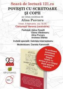 Vineri, 6 februarie 2015, ora 18.00, la Librăria Cărturești Verona (ceainărie), sub egida Serilor de lectură 121.ro, va avea loc o discuţie pornind de la volumul ”Poveşti cu scriitoare şi copii”, coordonat de Alina Purcaru, apărut în 2014 la Editura Polirom, și în ediţie digitală. Participă: Adina Rosetti, Elena Vlădăreanu, Alina Purcaru, Andreea Sfârlea. Invitată specială: Gabriela Adameșteanu. Moderatoare: Daniela Kammrath.