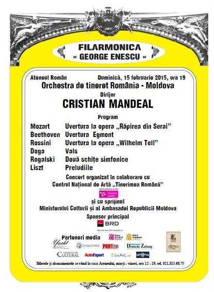 O premieră istorică! Duminică, 15 februarie 2015, ora 19.00, la Ateneul Român, tineri muzicieni de cea mai înaltă performanță din România și Republica Moldova se vor reuni sub bagheta dirijorului Cristian Mandeal. Orchestra Română de Tineret și Orchestra Națională de Tineret a Moldovei își reunesc forțele într-o orchestră simfonică a prieteniei artistice, care celebrează o spiritualitate și un fond cultural comun. Poveștile muzicale de mare popularitate semnate de Mozart, Rossini, Beethoven, Rogalski sau Liszt se vor reuni într-un concert organizat de Centrul National de Artă Tinerimea Română, cu sprijinul Ministerului Culturii și al Ambasadei Republicii Moldova la București. Sponsor principal BRD. Cu acest eveniment, Tinerimea Română scrie o pagină importantă a vastului său proiect de valorificare a potențialului artistic al tinerelor generații. Începută în urmă cu doi ani, colaborarea dintre Orchestra Română de Tineret și Orchestra de Tineret a Moldovei se concretizează acum prin cel mai amplu proiect comun.