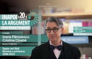 Joi, 26 martie 2015 , la ora 19.00, în librăria Humanitas de la Cișmigiu va avea loc a douăzecea ediție ”Înapoi la argument cu Horia-Roman Patapievici”, cu tema ”Șapte ani fără Monica Lovinescu, 2008-2015”. Invitate sunt Cristina Cioabă, cea care în 2010 a revenit asupra însemnărilor din cele șase jurnale ale Monicăi Lovinescu din perioada 1981-2000, selectând și concentrând istoria cuprinsă în ele în Jurnalul esențial apărut la editura Humanitas și Ioana Pârvulescu, cea care a semnat prefața acestui volum.