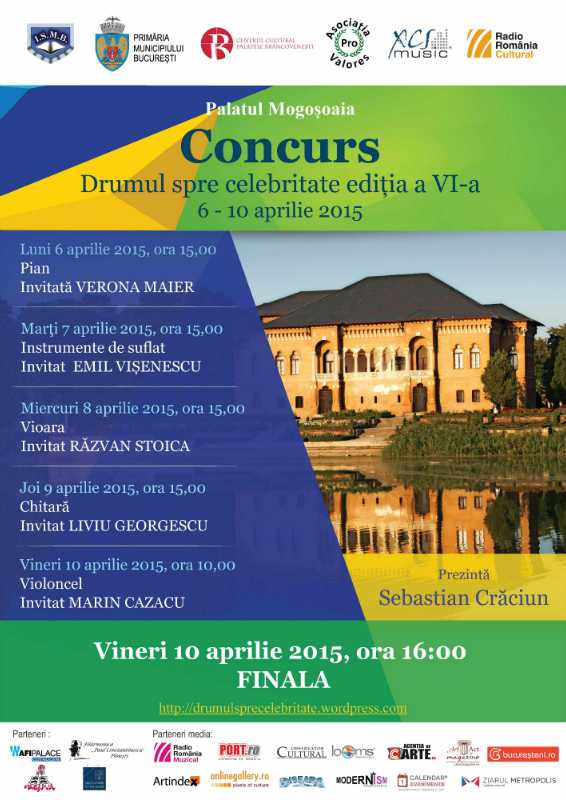 Debutează ediția a VI a a Concursului ”Drumul spre celebritate„ de la Palatul Mogoșoaia, proiect educațional complex organizat de: Primăria Municipiului Bucureşti prin Centrul Cultural Palatele Brâncoveneşti, Asociaţia Culturală “Pro Valores”, Radio România Cultural, Inspectoratul Şcolar al Municipiului Bucureşti şi ExcesMusic. Între 6 și 10 aprilie 2015, în urma preselecțiilor, își vor disputa supremația 26 de tineri muzicieni, împărțiți pe cinci categorii de instrumente: pian, instrumente de suflat, vioară, chitară și violoncel. AgențiadeCarte.ro este partener media al evenimmentului.