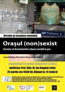 Miercuri, 25 martie 2015, orele 19.00-21.30, la Club A, va avea loc o nouă ediție a Cafenelei critice. În cadrul unui proiect de investigare şi de combatere a discriminării de gen din Bucureşti, intitulat ”Discriminări urbane. Program de cetăţenie activă sensibil la gen” (finanţat prin granturile SEE 2009-2014, în cadrul Fondului ONG în România), Societatea de Analize Feministe AnA şi Asociaţia Front au finalizat de curînd, mai întîi sub forma unui raport în versiune electronică, apoi ca volum tipărit, o cercetare asupra mai multor componente ale Capitalei din perspectiva aleasă: ”Oraşul (non)sexist. Inventar al discriminărilor urbane sensibil la gen”. Sunt examinate aici nume de străzi, tipuri de statui, publicitatea stradală, libertatea de mişcare şi de exprimare în spaţiul public de care se bucură femeile în Bucureşti etc. La Cafeneaua critică, echipa acestui spectaculos proiect feminist, coordonată de Laura Grünberg şi Diana Elena Neaga, e invitată pentru o discuţie la temă, alături de alte feministe/alţi feminişti, arhitecte/arhitecţi, urbaniste/urbanişti. Amfitrion: Ion Bogdan Lefter.