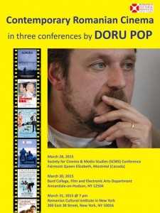 Mai întâi, cu suportul ICR New York, Doru Pop va participa la SCMS (Society for Cinema & Media Studies) Conference – eveniment de foarte mare impact şi vizibilitate, care va avea loc în perioada 25-29 martie 2015, la Montréal, în Canada. Aici, în data de 28 martie 2015, Doru Pop va prezenta conferinţa ”Between Realism, Minimalism, and Transnationalism. New Romanian Cinema as Transnational Cinema”, în cadrul unui panel dedicat cinema-ului românesc, coordonat de prof. dr. Christina Stojanova de la Departamentul de Film al University of Regina, abordând schimbările care au loc în cinematografia românească recentă sub presiunea globalizării şi reconfigurării pieţei internaţionale de film, la care Doru Pop se referă prin sintagma „cotitură transnaţională”. Doru Pop va face trimiteri la câteva dintre cele mai importante producţii cinematografice româneşti din perioada 2010-2014, precum ”Marţi după Crăciun” de Radu Muntean, ”Poziţia Copilului„ de Călin Peter Netzer sau „Metabolism” de Corneliu Porumboiu.