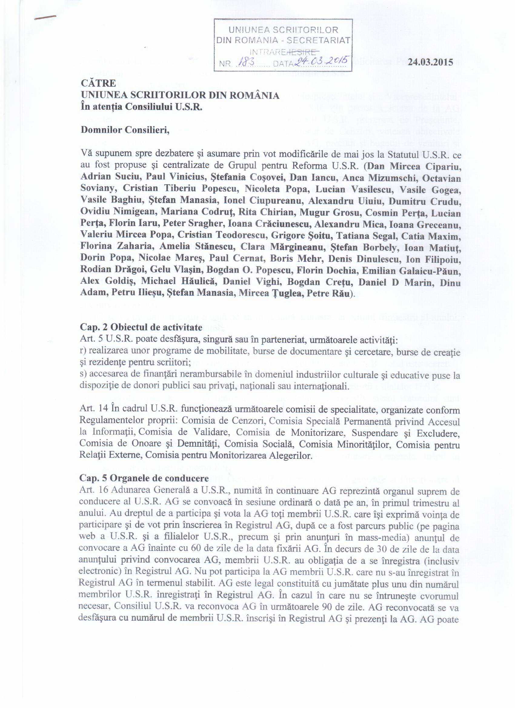 Vă supunem spre dezbatere și asumare prin vot modificările de mai jos la Statutul U.S.R. ce au fost propuse și centralizate de Grupul pentru Reforma U.S.R. (Dan Mircea Cipariu, Adrian Suciu, Paul Vinicius, Ştefania Coşovei, Dan Iancu, Anca Mizumschi, Octavian Soviany, Cristian Tiberiu Popescu, Nicoleta Popa, Lucian Vasilescu, Vasile Gogea, Vasile Baghiu, Ştefan Manasia, Ionel Ciupureanu, Alexandru Uiuiu, Dumitru Crudu, Ovidiu Nimigean, Mariana Codruţ, Rita Chirian, Mugur Grosu, Cosmin Perţa, Lucian Perţa, Florin Iaru, Peter Sragher, Ioana Crăciunescu, Alexandru Mica, Ioana Greceanu, Valeriu Mircea Popa, Cristian Teodorescu, Grigore Şoitu, Tatiana Segal, Catia Maxim, Florina Zaharia, Amelia Stănescu, Clara Mărgineanu, Ştefan Borbely, Ioan Matiuţ, Dorin Popa, Nicolae Mareş, Paul Cernat, Boris Mehr, Denis Dinulescu, Ion Filipoiu, Rodian Drăgoi, Gelu Vlaşin, Bogdan O. Popescu, Florin Dochia, Emilian Galaicu-Păun, Alex Goldiș, Michael Hăulică, Daniel Vighi, Bogdan Crețu, Daniel D Marin, Dinu Adam, Petru Ilieșu, Ștefan Manasia, Mircea Țuglea, Petre Rău, Daniel Vorona).