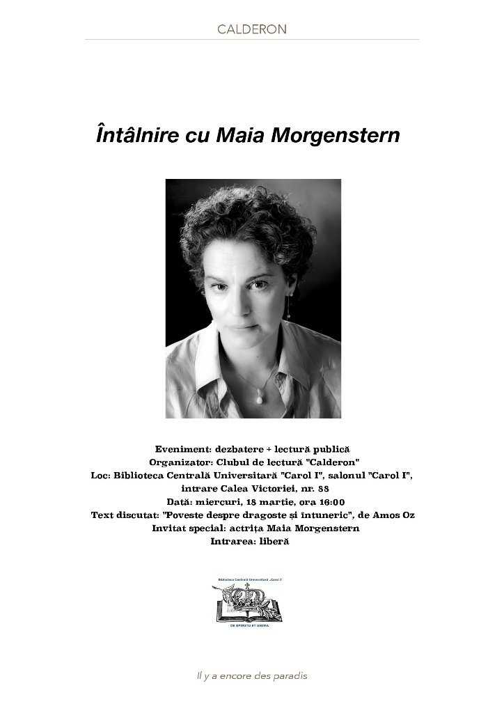 Miercuri, 18 martie 2015, ora 16.00, la Biblioteca Centrală Universitară din București, are loc o nouă ediție a Clubului de lectură „Calderon”. Dezbaterea dedicată volumului „Poveste despre dragoste și întuneric”, de Amos Oz, o are invitată specială pe actrița Maia Morgenstern. Artista nu doar că va participa la discuțiile obișnuite ale clubului, dar va da citire, din romanul autobiografic al lui Oz, unuia dintre pasajele sale preferate.