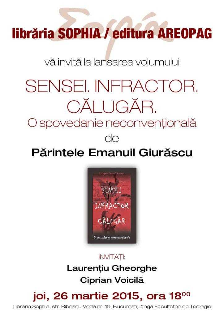 Joi, 26 martie 2015, ora 18.00,  Librăria Sophia și Editura Aeropag vă invită la o întâlnire prilejuită de lansare volumului „Sensei. Infractor. Călugăr. O spovedanie non-conformist”, a părintelui Emanuil Giurăscu. Invitați: Laurenţiu Gheorghe, filosof şi teolog; Ciprian Voicilă, sociolog.
