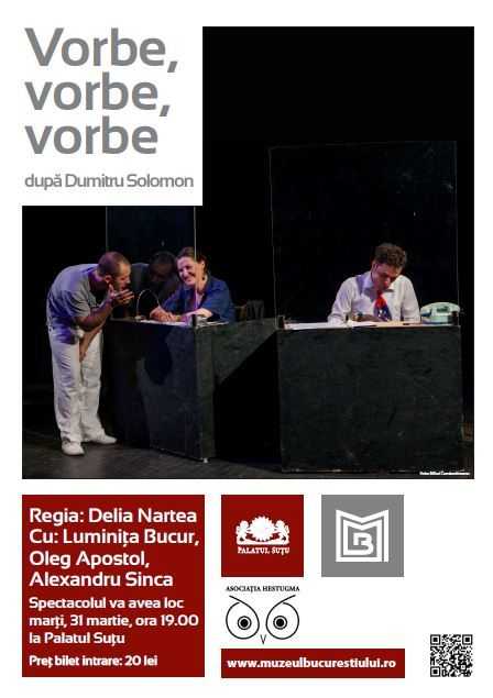 “Ziua Mondială a Teatrului este un prilej de sărbătorire a Teatrului în nenumăratele sale forme. Teatrul este o sursă de divertisment şi inspiraţie care are puterea de a uni diversele culturi şi popoare din întreaga lume. Dar el este mai mult decât atât, pentru că poate educa şi informa.”- Mesaj Internaţional 2010, Judi DENCH. Muzeul Municipiului Bucureşti – Palatul Suţu, marchează Ziua Mondială a Teatrului (27 Martie 2015) cu piesa „Vorbe, vorbe, vorbe”. Spectacolul se va juca marţi, 31 martie 2015, la ora 19:00 (Bulevardul Ion C. Brătianu nr. 2).