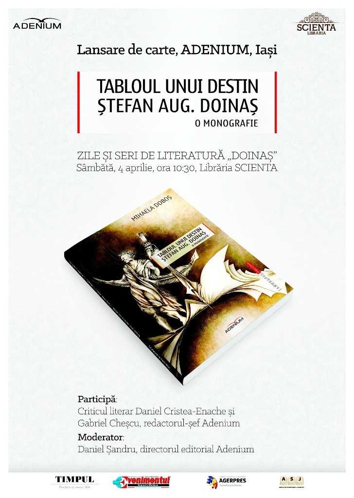 „Tabloul unui destin- Ștefan Aug. Doinaș” de Mihaela Doboș va fi prezentat la Arad, în cadrul Zilelor și Serilor de Literatură Doinaș. Sâmbătă, 4 aprilie 2015, de la ora 10:30, în incinta librăriei Scienta din Arad, iubitorii de literatură marca Doinaș, se vor întâlni cu Daniel Cristea-Enache (critic literar) și Gabriel Cheșcu (redactor-șef Adenium). Moderatorul evenimentului va fi Daniel Șandru (director editorial Adenium).