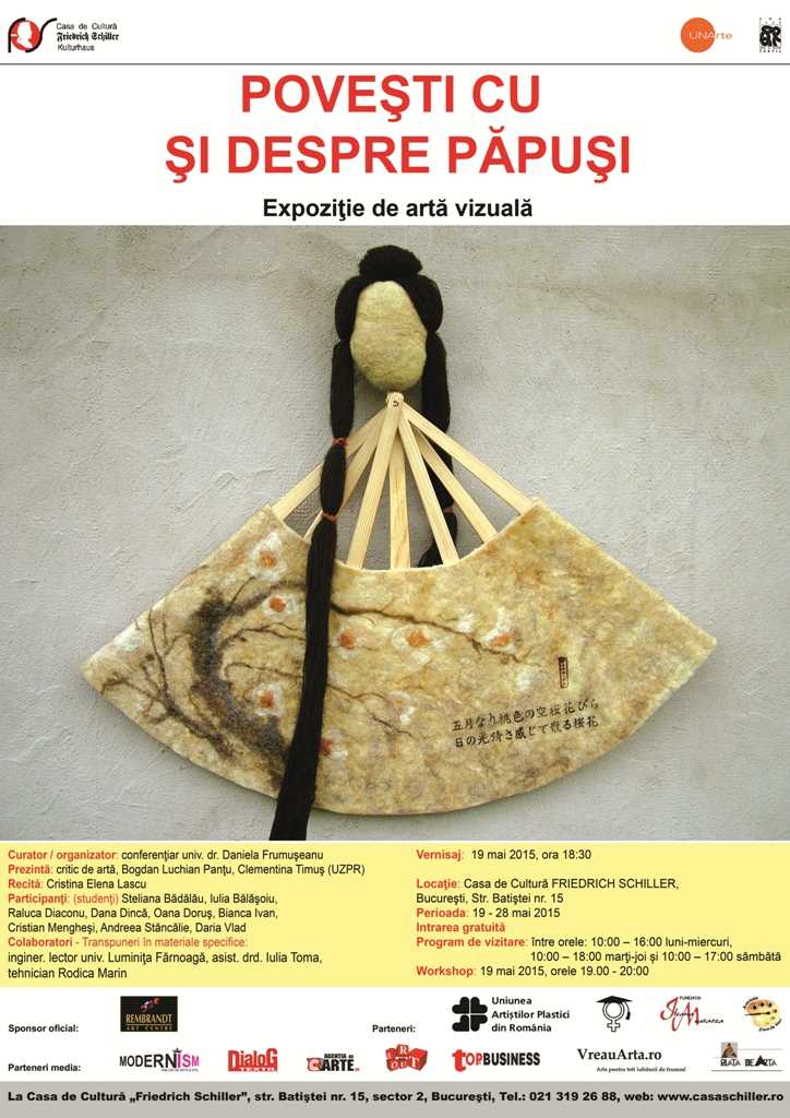Casa de Cultură „Friedrich Schiller” şi Universitatea Națională de Arte București organizează marți, 19 mai 2015, la ora 18:00, vernisajul expoziţei de artă vizuală „Povești cu și despre păpuși”, la sediul Casei Schiller din str. Batiștei nr. 15. Expoziţia are ca subiect principal păpuşa unicat supradimensionată, încadrată stilistic, inspirată din spaţii culturale diverse: Africa, India, Japonia, Mexic, Germania, Franţa, Anglia, America de Nord sau spaţiul ex sovietic. Cu acest prilej, tinerii creatori aduc în actualitate poveşti cunoscute sau neştiute, rescriind trasee tradiţionale, cărora le conferă un aer proaspăt, modern, sub forma păpuşilor personalizate (realizate în general din material textil imprimat, colat, brodat sau ţesut), decorate cu motive specifice diverselor arii stilistice. Pe simeze vor putea fi admirate şi studii de desen artistic documentar, studii de culoare sau suporturi textile imprimate serigrafic. AgențiadeCarte.ro este partener media al evenimentului.