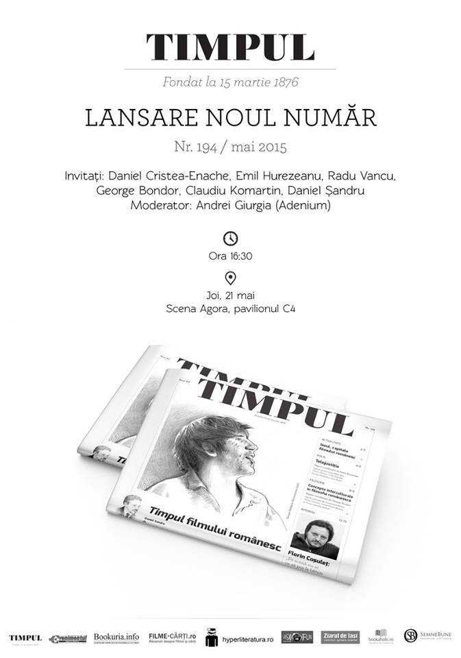 Revista se lansează joi, 21 mai 2015, la Bookfest, în cadrul evenimentelor Adenium și TIMPUL. Evenimentul îi are ca invitați pe Daniel Cristea-Enache, Emil Hurezeanu, Radu Vancu, George Bondor, Claudiu Komartin, Daniel Șandru. Dezbaterea va fi moderată de Andrei Giurgia. De asemenea, publicația poate fi achiziționată din centrele de presă Inmedio din toată țara, precum și din rețelele Cărturești, Librarium. În format digital, TIMPUL poate fi răsfoit pe elefant.ro.