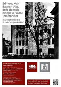 Joi, 18 iunie 2015, de la orele 19.00, la Muzeul Municipiului Bucureşti – Palatul Suţu, va avea loc o conferinţă dedicată arhitectului Edmond Van Saanen, co-autor a două simboluri bucureștene: Palatul Academiei de Studii Economice și Palatul Telefoanelor. Conferinţa va fi susţinută de istoricul de artă Oana Marinache. Născut în 1882, într-o familie burgheză, perfect integrată în societatea bucureşteană, arhitectul pătrunde repede în închisa lume a protipendadei. În 1915, realizează lucrări de amenajare la conacul familiei Chrissoveloni de la Ghidigeni, judeţul Galaţi, transformări la pavilionul de administraţie (arcade), marea sală de concert şi tenis, pavilionul de vânătoare, casa administratorului, pergole, colonadă, teren tenis. Tot în acel an, consemnează menajări la Casa Manole Diamandi din str. Columb nr. 5, din Bucureşti.