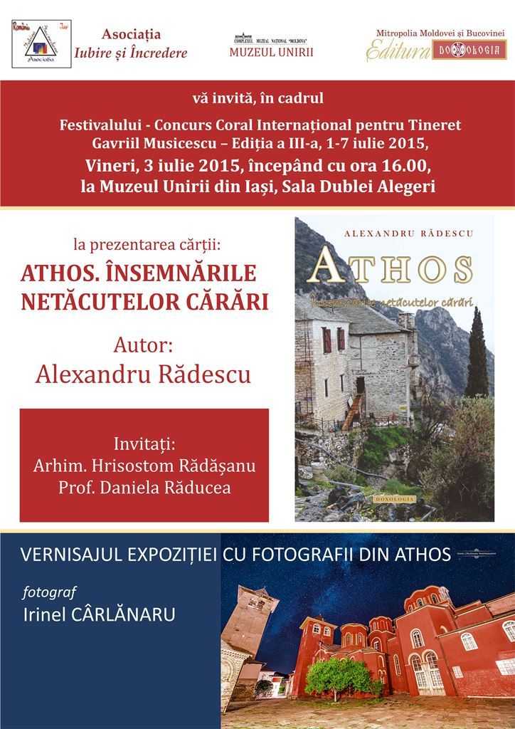 Vineri, 3 iulie 2015, de la ora 16.00, la Muzeul Unirii din Iași, Editura DOXOLOGIA a Mitropoliei Moldovei și Bucovinei va lansa cartea „Athos. Însemnările netăcutelor cărări” de Alexandru Rădescu. În cadrul acestui eveniment invitații vor putea admira și fotografii de la Muntele Athos, realizate de Irinel Cîrlănaru.