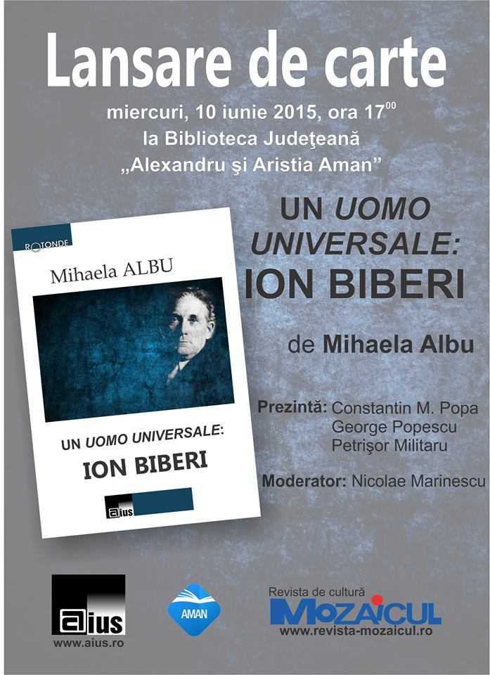 Editura Aius​  vă invită miercuri, 10 iunie 2015, ora 17.00, la Biblioteca Judeţeană ”Alexandru şi Aristia Aman” Craiova,​ la lansarea cărţii „Un uomo universale: Ion Biberi” de Mihaela Albu. Prezintă: Constantin M. Popa, George Popescu​, Petrişor Militaru. Moderator: Nicolae Marinescu.