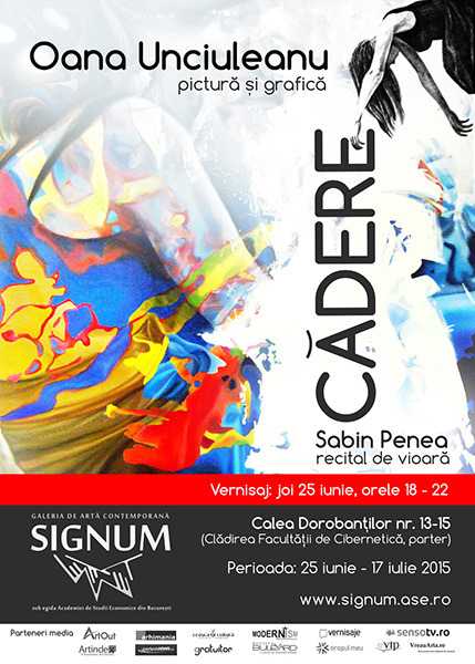 Joi, 25 iunie 2015, de la ora 18.00, la Galeria de artă contemporană ”Signum” (Calea Dorobanților 13-15, la parterul clădirii Facultății de Cibernetică, București), sub egida Academiei de Studii Economice din București, va avea loc vernisajul expoziției ”Cădere”, semnată de artista Oana Unciuleanu. În cadrul evenimentului va avea loc și un recital de vioară oferit de Sabin Penea. Expoziția, care face parte din proiectul ”Falling”, poate fi vizitată în perioada 25 iunie – 17 iulie 2015.Sunt permise comentariile oricărei persoane, fără discriminări pe criterii de rasă, sex, etnie, opţiune şi apartenenţă politică sau religioasă. Limbajul vulgar şi trivial în subsolul textelor nu este permis. Nu sunt permise opiniile calomnioase rasiste/şovine/xenofobe. Nu sunt permise atacuri la persoană în subsolurile textelor, ele sunt exclusiv pentru comentarii, critică literară, păreri despre text, dezbateri, etc. În caz contrar, ele vor fi scose din baza de date, fără nici o explicaţie din partea AgentiadeCarte. ro