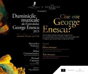 2015 este anul în care se împlinesc 60 de ani de când doar muzica lui George Enescu a rămas printre noi. Această ediție a Duminicilor Muzicale ale Festivalului Enescu își propune să-l (re)descopere pe muzician, punându-i  în valoare toate fațetele: cum se vede muzica lui Enescu de peste graniță, și cum este trăită și interpretată în România, dar și care sunt câteva dintre cheile personalității compozitorului român.