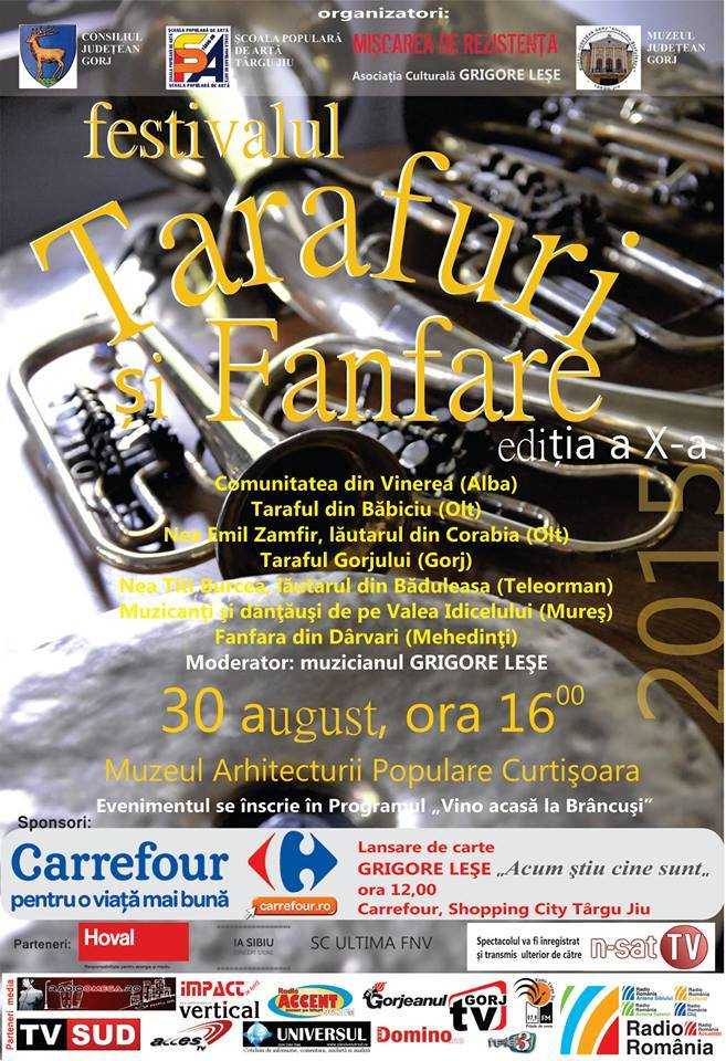 Ora 11.00: Vernisaj ”Bursa Brâncuşi” – Amplasarea a două lucrări de sculptură la Liceul Peştişani – Gorj; Locaţie: comuna Peştişani, Gorj. Ora 16.00: Festivalul fanfarelor şi tarafurilor” – moderator Grigore Leşe Locaţie: Muzeul Arhitecturii Populare Curtişoara