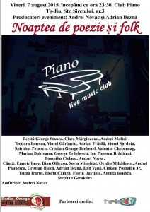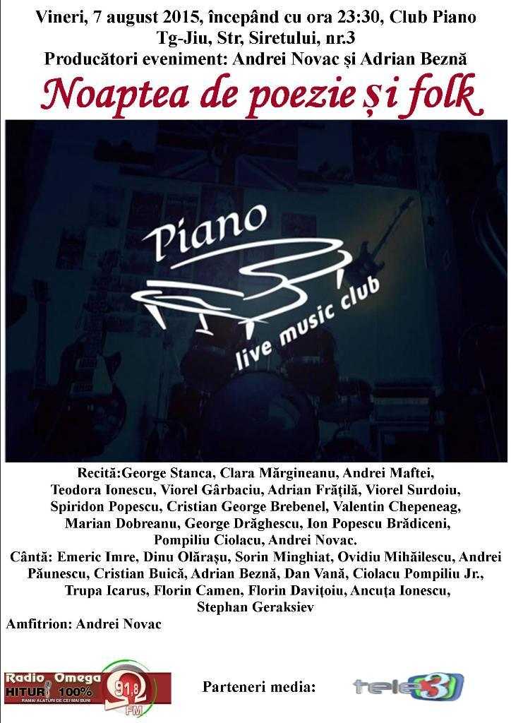 Vineri, 7 august 2015, începând cu ora 23:30, timp de peste 4 ore neîntrerupte, în Clubul Piano din Târgu Jiu, va avea  loc prima ediţie a evenimentului ”Noaptea de poezie și folk”. 17 poeți români contemporani (George Stanca, Clara Mărgineanu, Andrei Maftei, Teodora Ionescu, Viorel Gârbaciu, Adrian Frățilă, Viorel Surdoiu, Spiridon Popescu, Cristian George Brebenel, Vasile Ponea, Valentin Chepeneag, Marian Dobreanu, George Drăghescu, Adrian Beznă, Dinu Olărașu, Ion Popescu Brădiceni, Pompiliu Ciolacu, Andrei Novac), provenind din generaţii literare diferite, vor susține  lecturi publice de poezie, într-un dialog artistic cu : Emeric Imre, Dinu Olărașu, Sorin Minghiat, Ovidiu Mihăilescu, Andrei Păunescu, Cristian Buică, Adrian Beznă, Dan Vană, Ciolacu Pompiliu Jr, Trupa Icarus, Florin Camen, Florin Davițoiu, Ancuța Ionescu, Stephan Geraksiev.