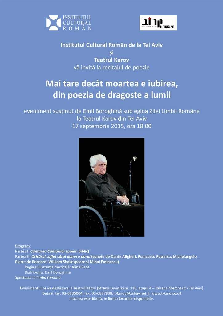 Joi, 17 septembrie 2015, ora 18:00, la Teatrul Karov din Tel Aviv, sub egida Zilei Limbii Române, Institutul Cultural Român de la Tel Aviv, în colaborare cu Teatrul Karov, organizează un recital extraordinar de poezie, cu titlul „Mai tare decât moartea e iubirea – din poezia de dragoste a lumii”, care fi susținut de actorul și regizorul român Emil Boroghină.
