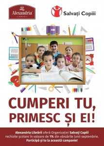 În perioada 1-30 septembrie 2015, clienții care vor pregăti ghiozdanele propriilor copii alături de noi și vor face orice achiziție din cele 30 de librării Alexandria aflate în 12 județe ale țării, vor sprijini și copiii nevoiași, pentru că anul acesta, Alexandria Librării donează sub formă de rechizite către Organizația “Salvați Copiii România” 1% din valoarea tuturor bonurilor fiscale din luna septembrie 2015. Astfel, fiecare persoană care va face cumpărături de orice natură din oricare din librăriile Alexandria se alătură acestei campanii și face un gest concret de încurajare a educației.