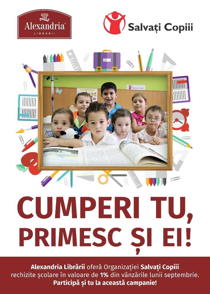 ”Din 1950 îți pregătim ghiozdanul. Suntem mândri de asta și îți mulțumim!” Acesta este mesajul cu care librăriile Alexandria își întâmpină clienții de ani de zile. Toamna aceasta, alături de Organizația „Salvați Copiii”, Alexandria Librării inițiază campania de responsabilitate socială CUMPERI TU, PRIMESC ȘI EI! și îi invită pe toți românii să se implice, astfel încât un număr cât mai mare de copii nevoiași să aibă ghiozdanele echipate pentru școală.