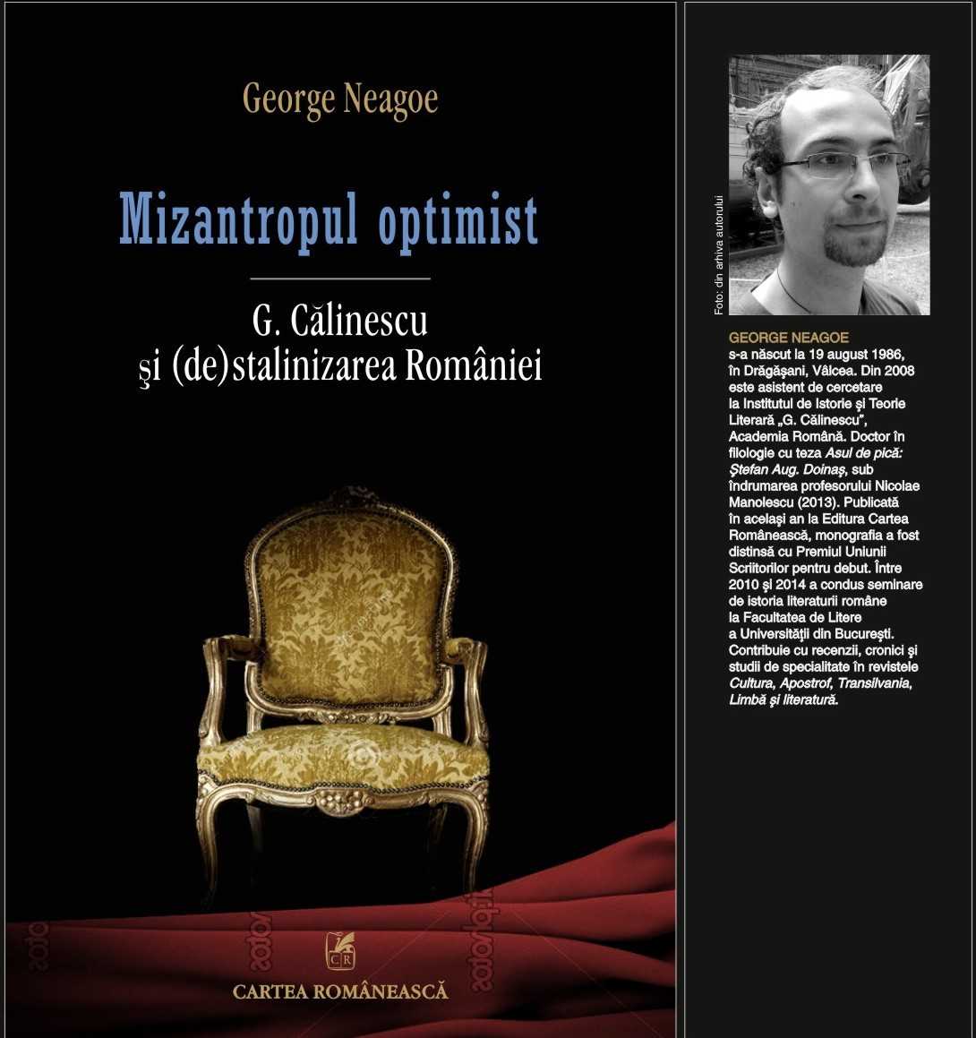 În curând, la Editura Cartea Românească, în Colecţia „Critică şi istorie literară” va apărea volumul ”Mizantropul optimist: G. Călinescu şi (de)stalinizarea României”, semnat de George Neagoe. Este vorba despre un proiect finanţat de AFCN. În ”Mizantropul optimist: G. Călinescu şi (de)stalinizarea României”, George Neagoe reface, în mare măsură, traseul prin care cel mai important critic literar român a ajuns să facă parte din organizaţiile de masă patronate de P.C.R. Întâi simpatizant al Uniunii Patrioţilor (1944-1945), ficţiune planificată de Ştefan Foriş, ulterior figură marcantă a Partidului Naţional Popular (1946-1949), G. Călinescu s-a arătat impresionist în politică, pe cât s-a dovedit în exegeză.