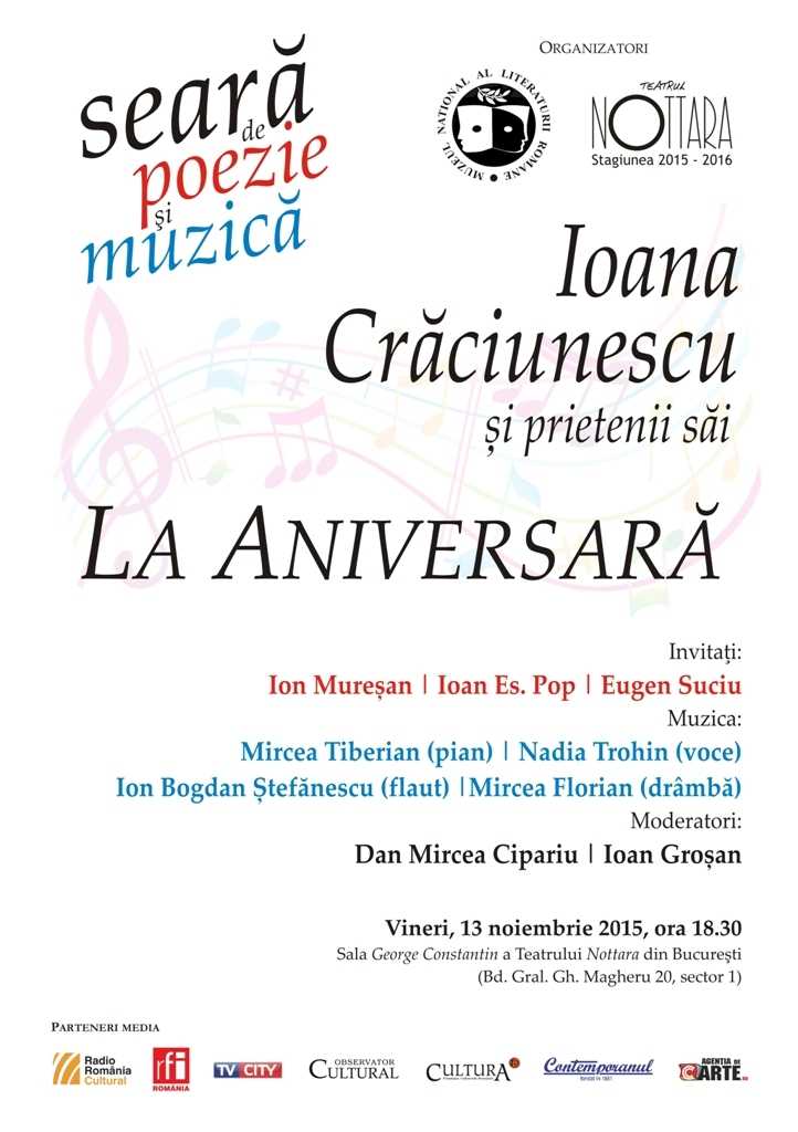 Vineri, 13 noiembrie 2015, ora 18.30, în Sala George Constantin a Teatrului Nottara din Bucureşti (Bd. Gral. Gh. Magheru, nr. 20, sector 1), Muzeul Naţional al Literaturii Române din Bucureşti organizează o Seară specială de poezie și muzică – Ioana Crăciunescu și prietenii săi. La Aniversară. Alături de sărbătorita Ioana Crăciunescu, vor susţine recitaluri publice de poezie Ion Mureșan, Ioan Es. Pop şi Eugen Suciu. Muzicienii invitaţi să rezoneze cu poezia şi biografia Ioanei Crăciunescu sunt Mircea Tiberian (pian), Nadia Trohin (voce), Ion Bogdan Ștefănescu (flaut) şi Mircea Florian (drâmbă). Moderatorii evenimentului sunt Dan Mircea Cipariu și Ioan Groșan. AgențiadeCarte.ro este partener media al evenimentului.