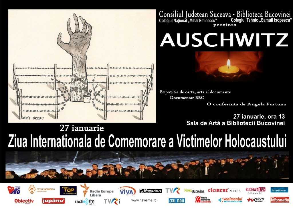 Miercuri, 27 ianuarie 2016, ora 13.00, în Sala de Arte a Bibliotecii Bucovinei, Consiliul Judeţean Suceava, Biblioteca Bucovinei “I.G.Sbiera”, Colegiul Naţional “Mihai Eminescu” şi Colegiul Tehnic “Samuil Isopescu” organizează manifestarea AUSCHWITZ, dedicată Zilei Internaţionale pentru Comemorarea Victimelor Holocaustului. Va fi vernisată o expoziţie de carte, artă şi documente, va fi proiectat un film documentar producţie BBC iar scriitoarea Angela FURTUNĂ, organizatoarea începând din 2005 a proiectului, va susţine o conferinţă despre moşteniri, martori şi mărturii post-totalitare, arhive şi pedagogia memoriei.