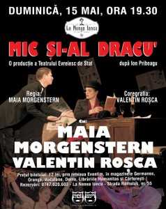 Duminică, 15 mai 2016, de la ora 19:30, iubitorii comediei autentice sunt invitați la spectacolul ”Mic și-al dracu’”, un dublu recital susținut de Maia Morgenstern și Valentin Roșca, în regia Maiei Morgenstern. Spectacolul va avea loc pe terasa berăriei – restaurant La Nenea Iancu din București (Strada Romulus nr. 55).
