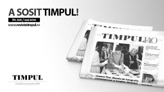 Revista de cultură contemporană TIMPUL vă aduce în atenție numărul lunii mai 2016. Nr. 206 al revistei va fi disponibil în scurt timp în toată țara prin rețeaua de distribuție Inmedio, rețelele de librării Humanitas, Cărturești (București, Cluj, Timișoara, Iași, Brașov) și Librarium (Timișoara, Cluj și Iași) și în format digital pe elefant.ro. Online, pe www.revistatimpul.ro, se regăsesc articolele din arhivă, precum și articolele ediției curente. Pentru a fi la curent cu toate noutățile, vă recomandăm să accesați și pagina de facebook a revistei TIMPUL și să vă abonați.