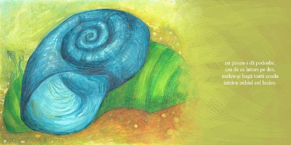 G.Ş: Eu sunt melcul, tu eşti melcul, sau un melc poate fi melcul… Un melc normal vorbeşte? Nuuuu, răspund copiii, de fiecare dată când citim din cartea asta, într-o clasă de şcoală sau de grădiniţă. Atunci, ce fel de melc este? Unul magic? Daaaa, răspund invariabil copiii. Şi fermecat, mai adaugă ei. Şi cum un melc fermecat nu poate fi povestit mai mult decât este el povestit in fabula, cred că nici eu nu ştiu cu adevărat cine este…