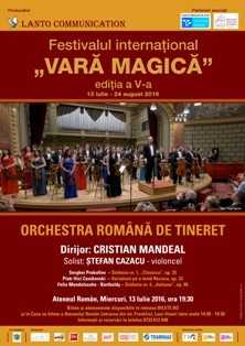 Miercuri, 13 iulie 2016, ora 19.00, la Ateneul Român, Orchestra Română de Tineret, sub bagheta lui Cristian Mandeal, deschide ediţia a cincea a Festivalului ”Vara Magică”. Solistul serii va fi tânărul violoncelist Ştefan Cazacu, care va interpreta ”Variațiuni pe o temă rococo pentru violoncel și orchestră”, op. 33 de Ceaikovski, iar programul va mai cuprinde Simfonia nr. 1 în Re major, op. 25 – ”Clasica” de Prokofiev şi Simfonia nr. 4 în La major, op. 90 – ”Italiana” de Mendelssohn. Aceste lucrări cunoscute ca fiind dintre cele mai atractive și captivante pagini ale literaturii romantice și post-romantice vor beneficia de versiuni pline de energie și strălucire, făcând din programul serii o experiență artistică de neuitat. Pe scenă se va afla elita tinerei generații de muzicieni români, care sub conducerea și formarea muzicală a dirijorului Cristian Mandeal a fost răsplătită de ovațiile publicului în marile săli de concert ale Europei.